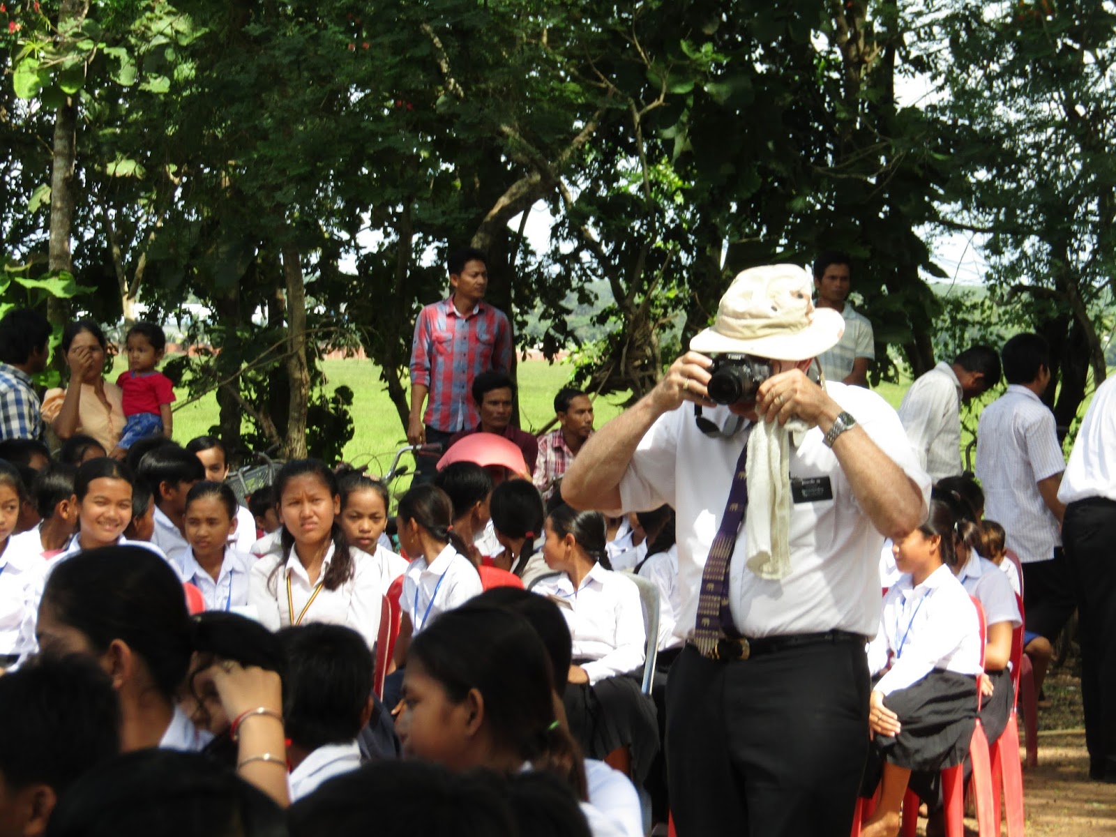 Hi ….it’s your mom…Just wanted you to know we think of you and we pray for each of you and your families EVERY DAY.There’s really SO MUCH to tell you – probably have forgotten more than I remember. Wish I were better - but I'm STILL, and will always be, the worst procrastinator - I should be writing ALL the things that are happening to us in a journal - unfortunately everything is moving SO fast we're just trying to catch up each day. It seems we stand up from our morning prayers just to be kneeling down at night and not believing another day has passed us by. Hearing of the sudden passing of Mary Taylor caused us to think more of our own fragile mortality....really we’re not that many years younger than she. And we just never know the hour or the day the call will come right? Dad and I have laughed together about the cost (way too expensive) or government red tape, documents to get our bodies out of Cambodia IF something were to happen to us here – We've about decided it would have to be cremated and go home in a vase. NOW the was morbid. (YES I’m still talking about death). But hey you all remember my reoccurring dream of being hit broadside in a car all these years… well, that COULD really happen here. I’m telling you the traffic is INSANE – we feel exhausted after a day out maneuvering through places we need to be and places we need to go. You have to experience it to believe it. Gone are the days of “hey honey, think I’ll run over to Target, or CVS or Hobby Lobby, or the mall – it is SO stressful just to go a couple of miles….and forget about it AFTER DARK! We have a crazy week this week out in the traffic including 6 apartment inspections (various parts of the city) , meetings with prospective sponsors for Folk Dancing Event, Zone Conference on Friday….Conference calls with our Director in Hong Kong, lots of emails and planning. Of course, my indoor laundry and ironing day.As you can imagine we have some hilarious stories of escorting (herding) 25 Viet/Cambodian Saints through airports, customs, hotels, on our Pilgrimage to the temple in Manila. Think we’ve already told you most of this but thought I would get it in writing. We had never met them until the day we departed….and yet came back having an affection for each that will live on always in our hearts . Of course, we speak neither Vietnamese OR Khmer and had only ONE translator for the entire group. I think after this I could play a pretty mean game of charades. I mean "you just can't make these things up." I posted about 30 pictures on Facebook - but I'll tell you ONE funny story. I suppose the tallest person in the Philippines would be 5'2” 5”3” so picture me in ONE of their Temple Dresses....NO KIDDING when I got dressed the arm length was at my elbow, the hem almost to my knee but the funniest was when I came out of the locker after dressing, (to my dismay) when I went to put the locker key in my pocket I couldn’t find it…. it was up under my arm pit....not a pretty sight. We traveled home after 4 exhausting days (8 hours each day in the Temple) and returned home after 15 hour brutal flights with a connection in Siem Reap. Just getting ALL the sweet saints through customs would prove to be a comical skit. They each had a lan Dad had that stick we made up stick with colored ribbons tied to the top - they could find and follow him in crowds...I hung back and would bring up the rear..We landed back in Phnom Penh around midnight got a taxi and dragged our sorry bodies and luggage up to our 5th floor apartment now it was 2:30 a.m. Sunday morning. In truth, we were feeling EVERY year of our 73 years....ALL we wanted to do is get in bed. We opened our suitcase to just get our toothbrush out to brush our teeth, wash our face...BUT when we unzipped the luggage, baggage handlers (either in Manila OR in Siem Reap), had rifled through our luggage and stolen all my jewelry (watches etc) (I didn't bring that much in the first place) and my Make-up. NOW the truth is I can do without the jewelry but the make-up NOT SO MUCH. I brushed my teeth feeling tired and a bit angry as I was washing my face, I carelessly pushed my contact up into my brain I think - (not really) but way up under my eyelid OUCH...for the next hour it was two blind people trying to retrieve it . Lance with a flashlight and I “whining” - We finally pulled it out only to find it had ripped into TWO pieces. So for the next two days had to put a patch on it -( I should say a band aid) we didn't go to the doctor. ... but we are sure my cornea was scratched...hurt to blink and light was especially painful. Have you ever seen someone wearing glasses with a patch underneath on one of the eyes? If it’s hard to visualize….I’ve attached a picture for you viewing pleasure.(Murphey’s Law). Well, It gooped, ran, hurt, vision was blurry for nearly 7 days – then I was sitting at the table reached up and the other piece just came out on my finger. Now, I go around singing..."I can see clearly now." Remember that old song?I swear if you could see me - my hair and eyebrows are falling out....that picture with the grandmother’s out in Svay Rieng Province? That was the day we got to take part when the Church provided food for 1200 families. What isn’t pictured is the sweat running down my back and off my face. It’s so hot humidity so high within minutes my hair is flat….but I’ll never forget the look in their eyes as they received the needed food for themselves and their families.My face has shriveled up like a prune, I had all those wrinkles but now there are vertical wrinkles that go from my cheekbones to my jawline...I have to open the crease (fold over) to put my antiaging cream in those areas .my toenail (with fungus) fell off and I to add insult to injury...we told you that I took a nasty fall in church parking lot Sunday evening as we were leaving church (not a pretty sight). Lance was getting in the driver's sid